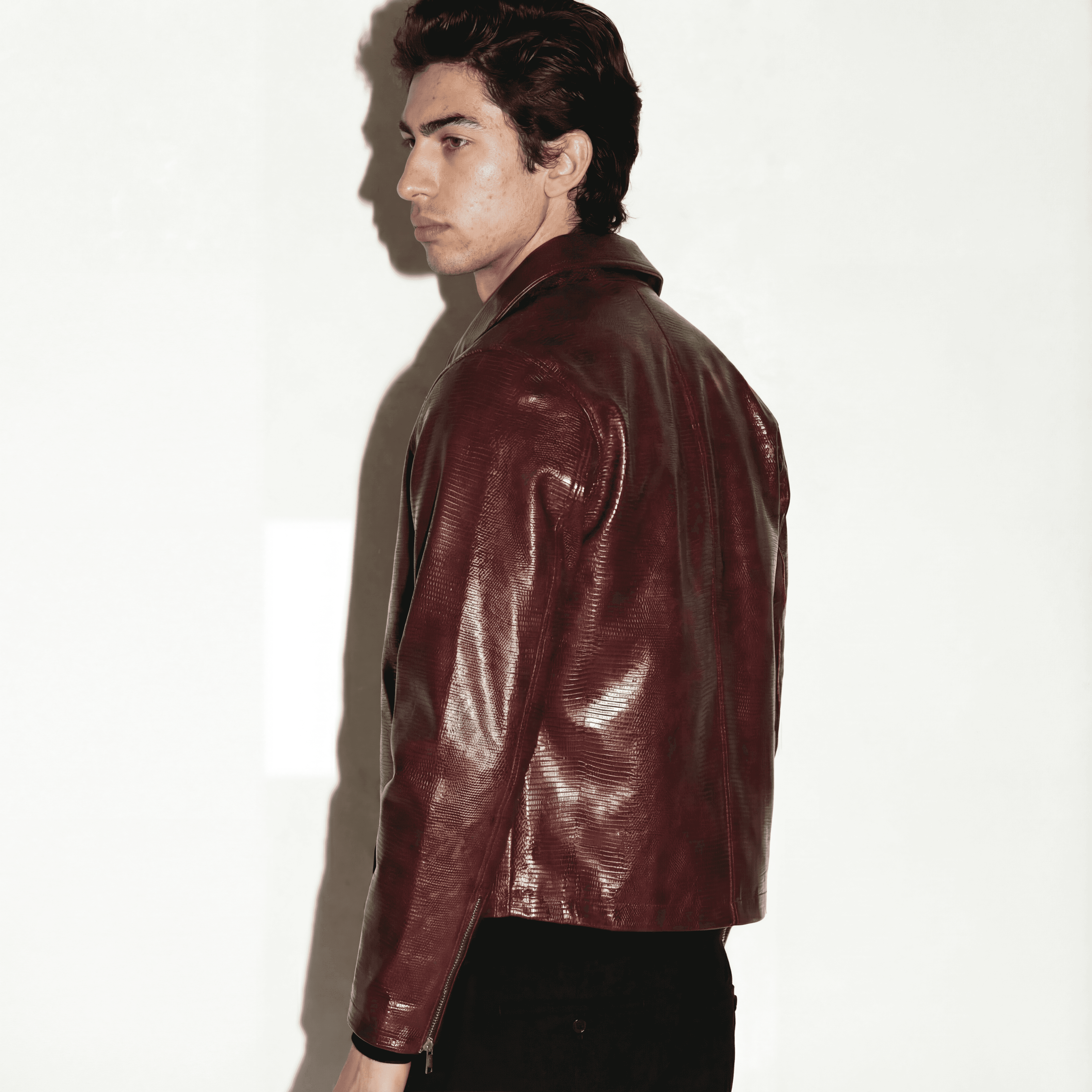 Arterial is a study in exposure and precision, defined by cut rather than insulation. A cropped leather form shaped close to the body, finished in a blood-toned surface that reflects pressure and movement. Constructed to sit sharp at the waist and clean through the shoulder, holding tension in every line. Designed to be worn as a second skin, not a layer.